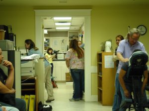 Leslie Kemp was the original clinic social worker. Her philosophy of care was to always solve the problem and never simply refer patients elsewhere. She made home visits as needed and she also ran the front desk, inviting each person who came into the clinic to sit down next to her (vs. the patient standing in front of her desk or sitting across the desk) as she completed intake/registration, and identified problems that were not readily apparent. She always had 1-2 students working with her/learning from her in the clinic. As time passed she took on more administrative work and eventually began working as clinic director. The director position was a sacrifice for Leslie as she far preferred working directly with patients and families. She began working with foundations and writing grant proposals along with administrative work and still seeing patients. When Leslie left the clinic she left behind a lean services-oriented organization in which everyone saw patients. We had an excellent reputation in the community (among healthcare providers, foundations, other organizations, and patients and families) and a large funding surplus. Photo: Leslie on the phone, with Maria and Luvia, the translator and her baby, the patient, and in the foreground Roxanne and Lupe.