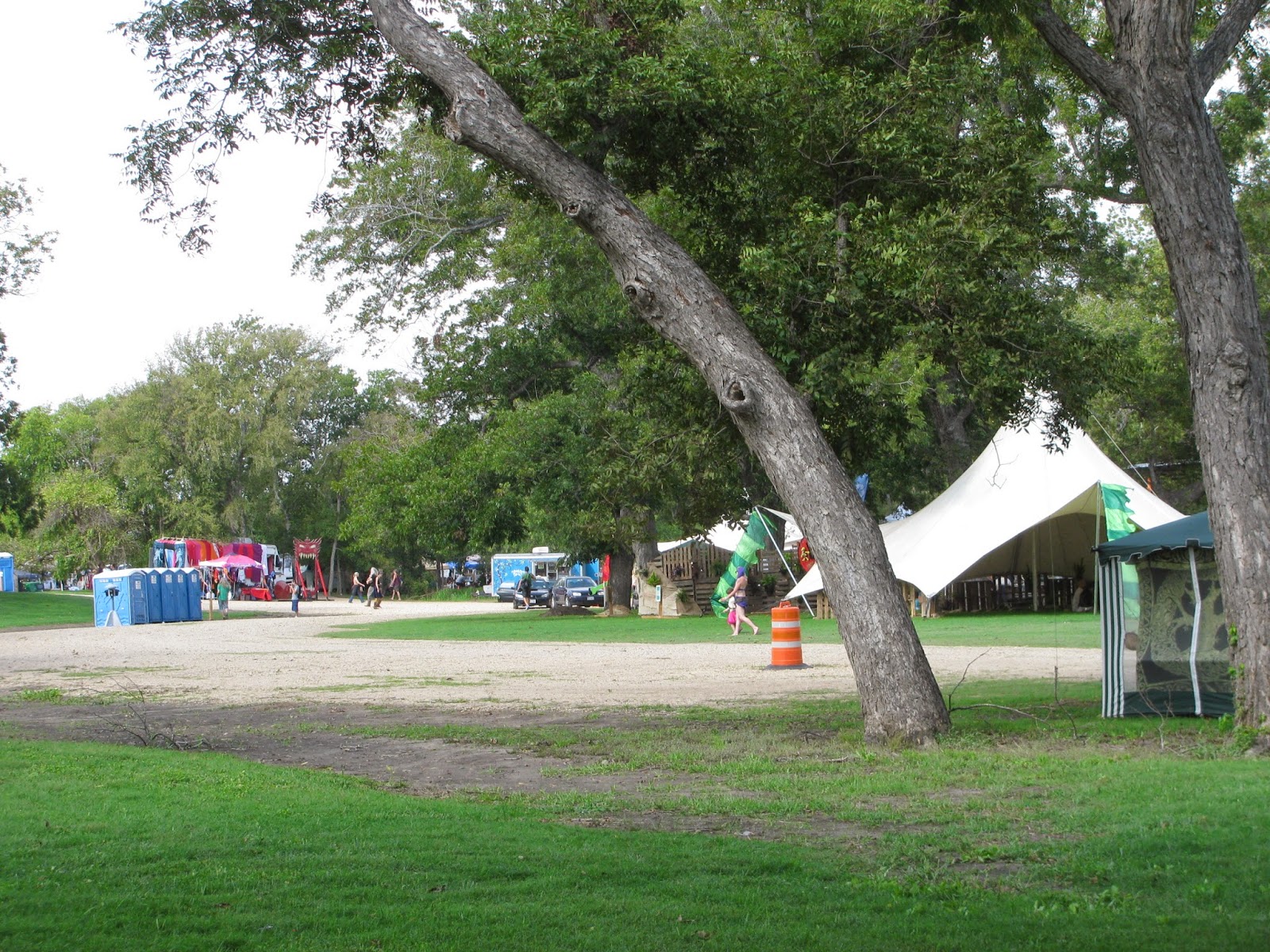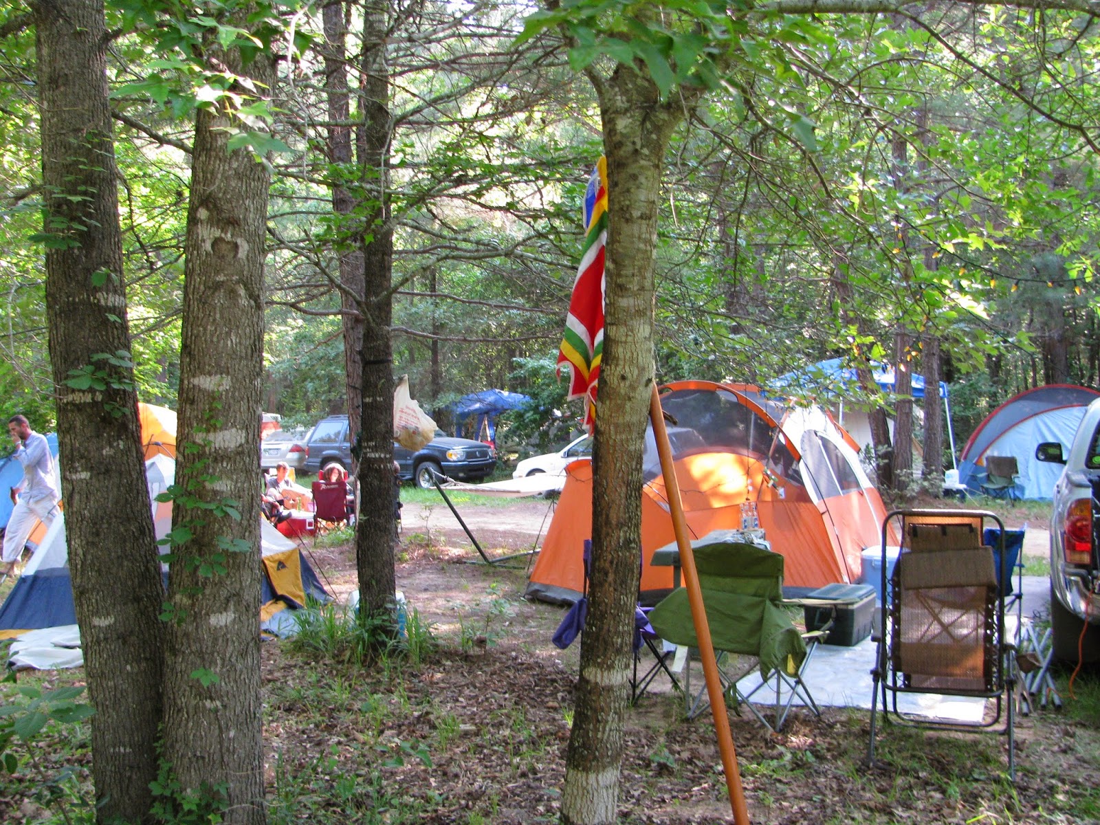 Drive further along that one lane road, up hill and down dale, until you start to see scattered campsites with tents and canopies, sometimes with cars and trucks parked around. Some gatherings have no car camping, some have limited car camping, and at some, almost everyone is car-camping. Car-camping just means driving in and pitching a tent next to your car or truck. Some people sleep in their van or SUV.