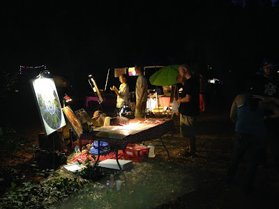 There are artists set up beside the dance floor (which, by the way, is dirt or sand, usually shaded by trees and maybe a fabric shade). These are visionary artists who will paint or draw or otherwise create art throughout the gathering. Two of the artists you’ll sometimes see at Texas, Colorado, and other regional events are ChopsWanderweird and Chance Roberts.