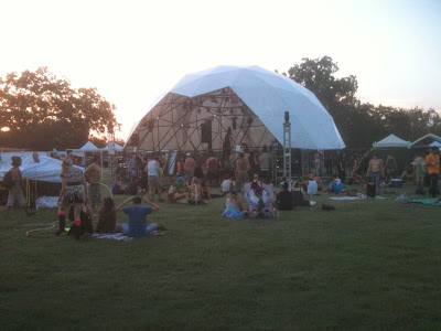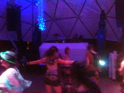 At the events put on by Atrium Obscurum the music starts Friday night about 9 and stops Sunday about noon with the main climax happening from about 4 to 6 Sunday morning. There is a main stage for dancing and a chill dome for cooling out, though there is a lot of back and forth and at times there may be more people dancing at the chill dome than the main stage.