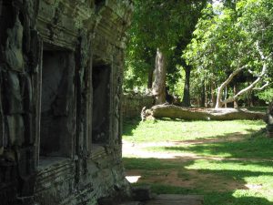 tourists are gone and there are only the sounds of the forest and our own occasional conversations. It’s hot here, but not bad in the shade and we’re slow-walking for sure through series of doorways through the centers of the structures, through narrow dark corridors, across jumbled piles of large sandstone blocks at the edges, and along dirt paths through the forest outside. And coming back, as we near the entrance, again, the sounds of the music.