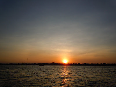 Notes taken on the bus from Saigon to Phnom Penh, staring out the window, in a dream… On the road again, through the streets of Saigon where there are more trees in some (older) neighborhoods than one might expect. The streets aren’t nearly as full today as on days before – Tet! Drummers and dancers coming through the neighborhood yesterday. The dancers wear silk robes – one dancer has a jolly, but kind of menacing mask and the other has a bearded sage face; both carry fans and one of them fanned bad winds or spirits out of Leslie. Photo: Sunset over the Mekong