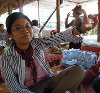 We brought water; beer; soda; Samnang’s bottle of liquid herbal medicine; and my frozen bottle of tea. The girls actually wore long sleeves and Sokkhom brought (and wore) neck scarves for all the women. Needless to say, I just carried mine.
