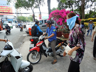 On to Binh Thanh Market. To get there you walk through a big park which is currently filled with flower and bonsai vendors in the most amazing display I’ve ever seen – and I’ve seen a few flower shows. We wandered through the flowers for awhile, then to the market where we got pretty much over-heated. Binh Thanh is the main tourist market in Saigon, so in addition to areas set up for locals, there are many stalls selling the same old stuff for tourists. Since this is Tet season, there are quite a few Viet Khieu (overseas Vietnamese) in town and the joint was jumping. I had decent Bun bo Hue, but Leslie was so over-heated she didn’t eat.