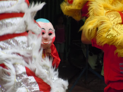 the passage opening up and out in to an open area next to a large market and some people around and lion dancers leaping and whirling and shaking their heads and of course the weird round-faced mask guy fanning ghosts. Photo: The round-headed guy who’s always a part of the Lion Dance