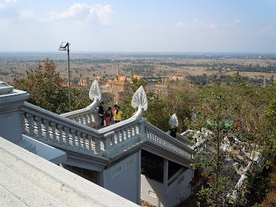 the mountain: After lunch, in the heat of the day, cousin David, uncle Da, Chanmony, Chansophear, and I headed up the hill to the stupas. It was a hot walk, three hundred and some odd steps past quite a few beggars to the stupa, but not bad. Oh, there’s another stupa, up more steps and past more beggars and another and another, so by the time we got to the last one, I was pretty hot – we were all hot and sweaty, even cousin David (the one who set the pace). From the last stupa we could see far across this flat, green watery land – it was like we could see across Cambodia. The stairs down were very crowded with fellow holidayers (that’s the short way up and down) and more beggars and even some monkeys. Photo: The view from the mountain