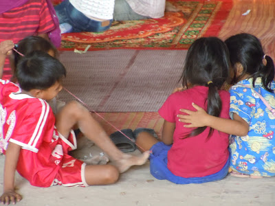 food vendors. The opposite side of the road had long thatched-roof pavilions with wooden platforms covered in mats for families to rent for picnics. We unloaded water, etc. from the car onto one of the platforms and David, Jeudi, Da, and Sokkhom went off to fetch an assortment of food from various vendors. We ended up with whole fish (1 large and 4 small) fire-roasted on skewers; chicken with ginger (every piece perfect with its fair share of bone); a whole roasted chicken; hot pot with soup, vegetables and assorted meat; lotus seeds; whole steamed tamarind; rice steamed in metal tubes served with sugar, cinnamon and grated coconut; other gelatinous, sweet morsels. Amazing! Photo below: One of my favorite photos – children in a temple