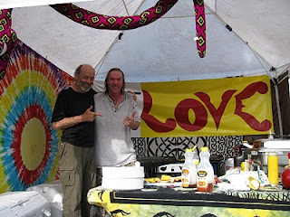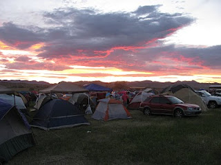site, where because of eagles nesting, camping alongside the river and under the trees next to the music had been changed to a treeless field far from any water and a 40 minute drive from the music. We camped kind of at the edge, near some other older people and a coffee and taco stand. A 20-something woman camping nearby attached herself to us and we had good times sitting around the campsite. When it came time to head to the music, the organizers had just one or two buses running and there about a hundred people clustered at the bus door, reminiscent of buses in Phnom Penh, except the buses there are spiffer. So we just spent several nice, though sunny days at the campsite.