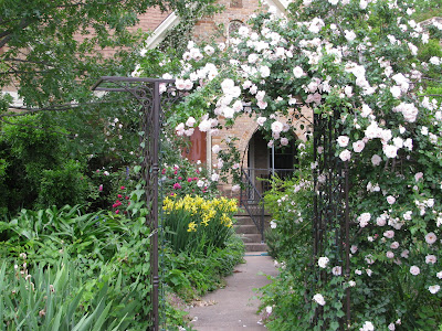There are 15 or more roses in our front yard. There are bushes, ramblers, and climbers. A few, like New Dawn (1930) and Don Juan (1958) are more modern, but most, like Zepherine Drouhin (1868), Cecile Brunner (1894), and Perle d’Or (1884) are old garden roses. The fragrance is intense, with the classic rose scent of Maggie and the delicate bouquet of the New Dawn in magnificent bloom on the arbor at the walkway to the house and again over the front door mixed in with the Confederate jasmine climbing with countless tiny star blooms all the way to the peak of the roof.