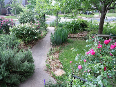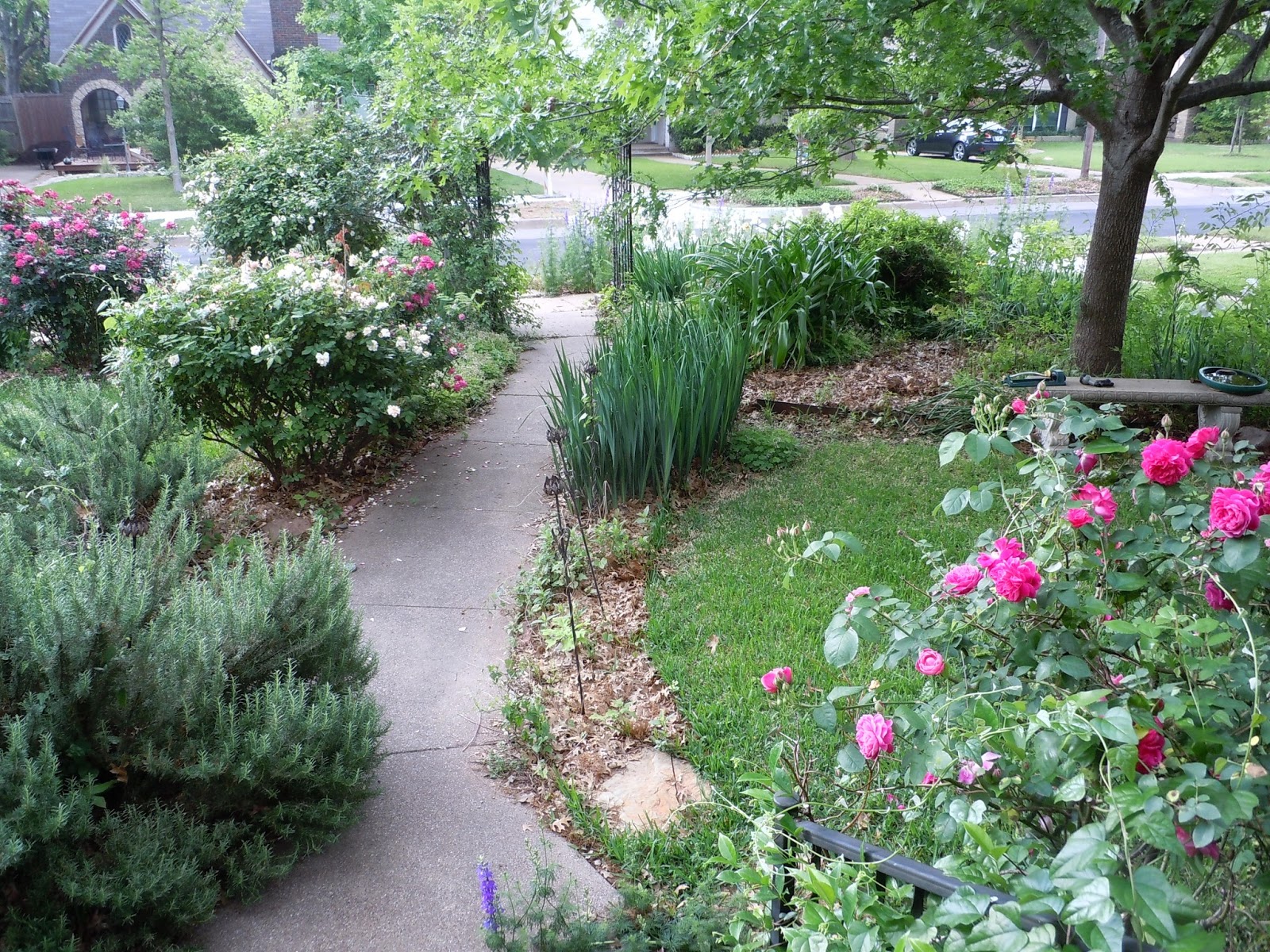 Katy Road Pink (found rose), Duchesse de Brabant (1857, Teddy Roosevelt’s favorite boutonniere rose), and Belinda’s Dream (1992) are blooming out front.