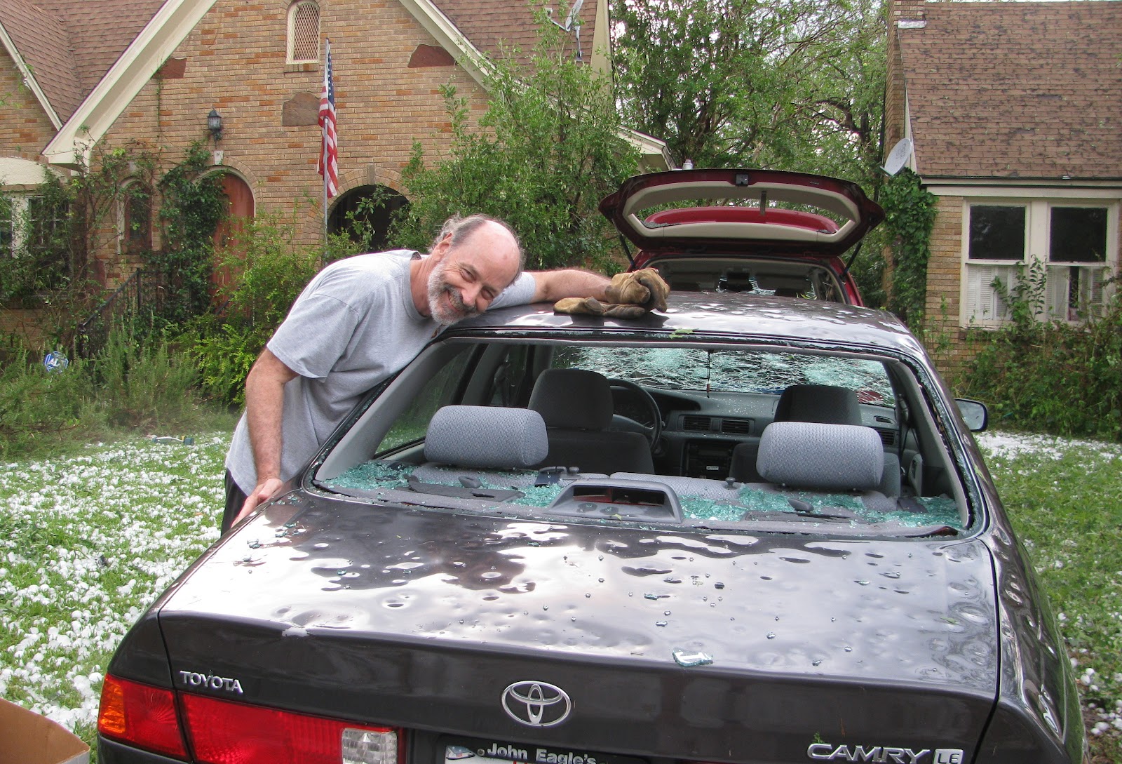 It was the worst hail I’ve seen and when it was over, water was coming through the ceilings in five rooms of our house, there was structural damage in the attic, and a couple of windows broken (including a small section of a stained glass window). Both cars were trashed, the garden destroyed (except the roses did okay), trees stripped, bird bath broken, and even the charcoal grill was bent. And I keep finding other things.