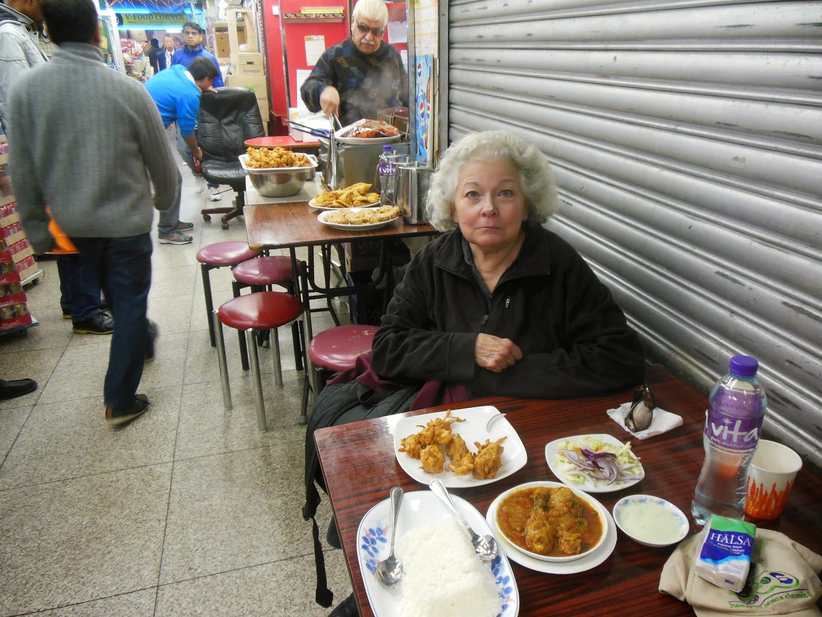 On our last full day we went to the Chungking Mansions for some Indian food and ended up at a Pakistani place having a good, cheap meal of chicken tikka masala, naan, pakoras, vegetable samosas, and milk tea. The place had one table, which we